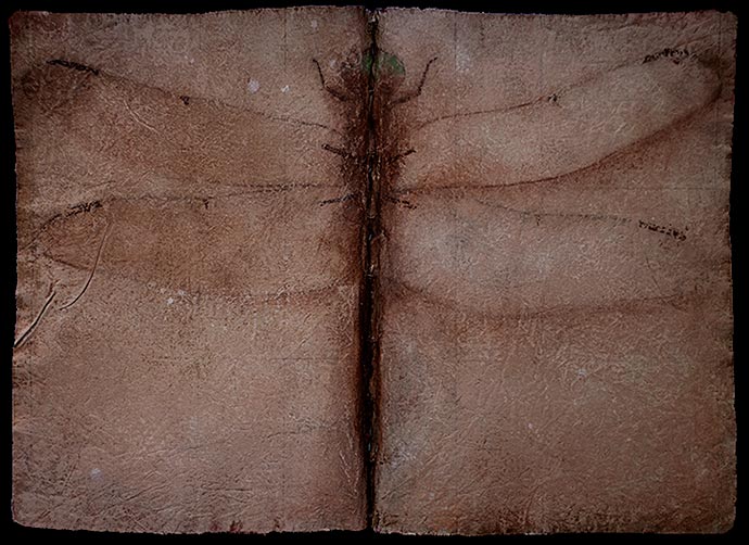 This dragonfly is a work in progress, something for an upcoming exhibition at Virginia Tech. The alert visitor to this website will recognize at least two recurring themes here: one is insects and the other is the folio, the appearance of an open book. In this case the book seems to be very old, possibly several centuries old. It may not be apparent on your screen, but this would be a very large book; it's 42 x 56 inches. The look of three dimensionality is actual; the two halves are stitched together with jute twine, which has the appearance of some kind of leather. There is no special meaning assigned to any of this, but I would say that I'm guided by a mysterious process of being attracted to particular visual impacts, in this case it's the visual impact of a very old book. By the time a book has made its way through the centuries it develops signs of wear and tear – spots, discolorations, wrinkles, rips and a relaxed sense of settledness into what it is. Why dragonflies? According to the website, Dragonfly-site.com, “The dragonfly, in almost every part of the world symbolizes change and change in the perspective of self realization; and the kind of change that has its source in mental and emotional maturity and the understanding of the deeper meaning of life.”
